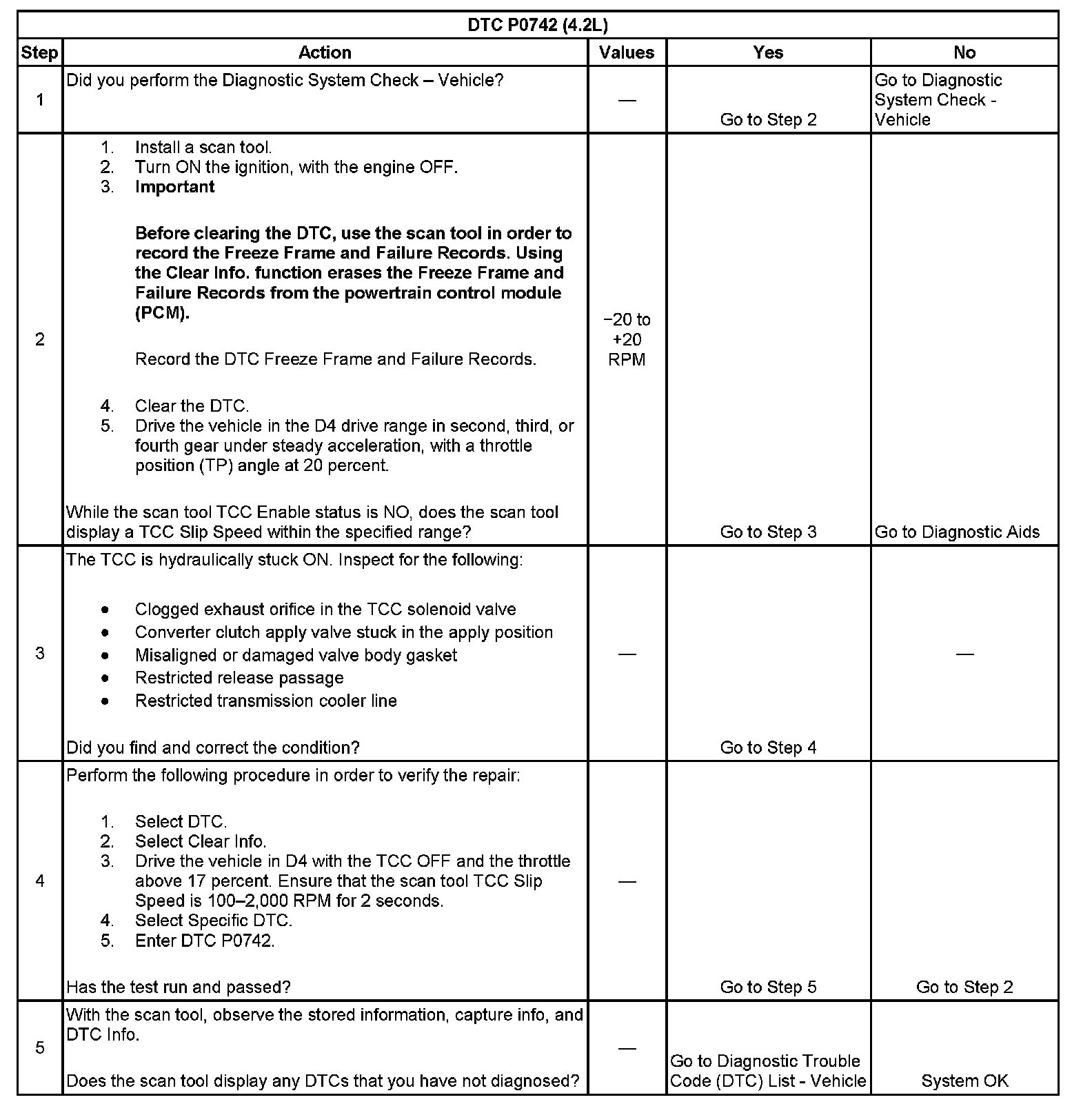 When the PCM detects low torque converter slip when the TCC is commanded OFF, then DTC P0742 sets. DTC P0742 is a type B DTC.