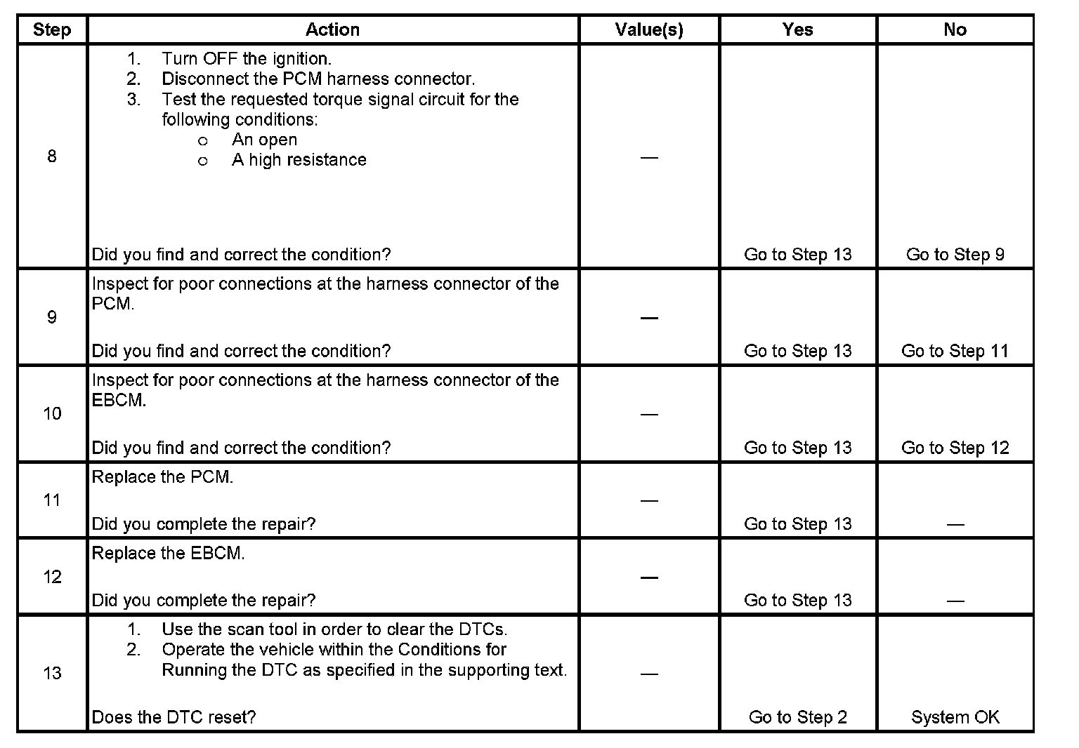 The PCM diagnoses the requested torque PWM signal circuit and sends a class 2 serial data message to the EBCM indicating a fault is present. A fault exists in the circuit if the PCM detects one of the following conditions: