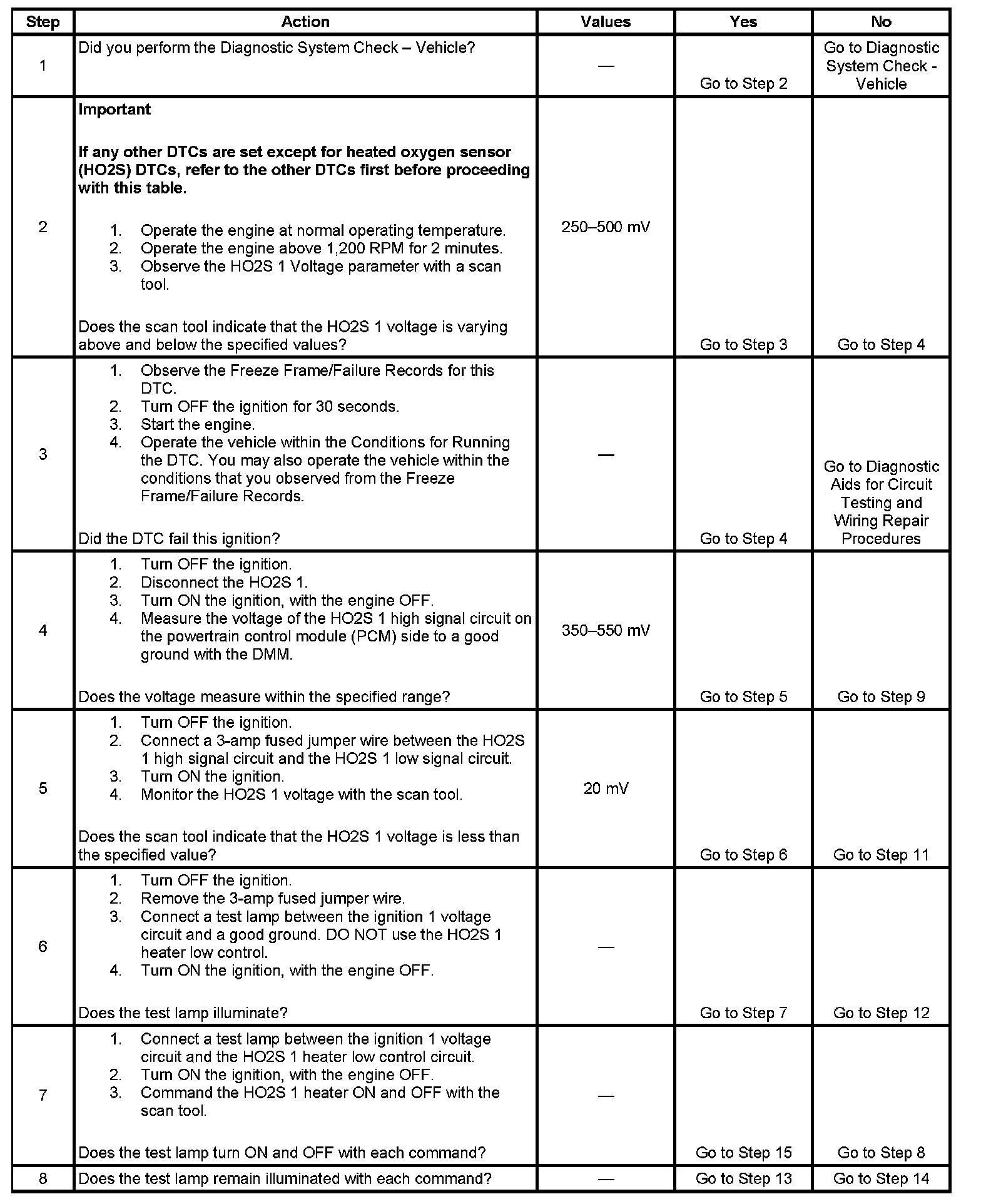 2. When the system is operating correctly, the HO2S 1 voltage should toggle above and below the specified values. You may need to operate the vehicle within the Freeze Frame conditions and Conditions for Setting the DTC in order to duplicate the malfunction that was detected by the PCM.