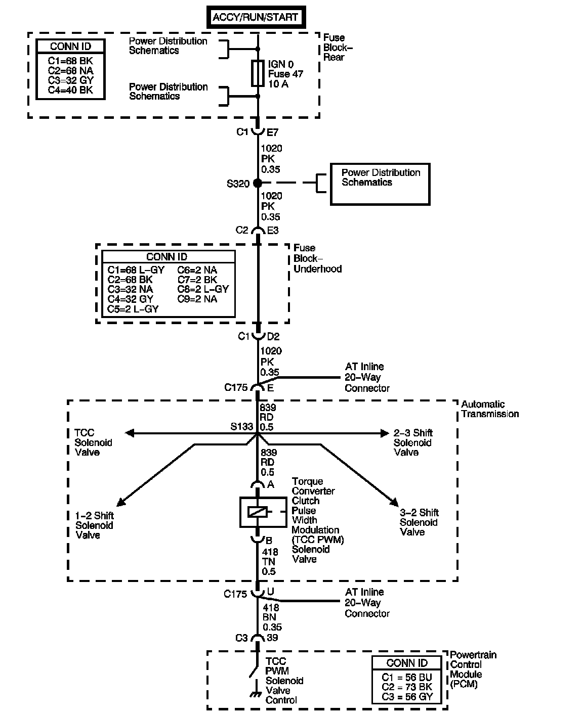 The torque converter clutch pulse width modulation (TCC PWM) solenoid valve controls the fluid acting on the converter clutch valve. The converter clutch valve controls the torque converter clutch (TCC) application and release. The solenoid attaches to the control valve body within the transmission. The solenoid receives ignition voltage through the Ignition 0 voltage circuit. The powertrain control module (PCM) controls the solenoid by providing a ground path on the TCC PWM solenoid valve control circuit. Current flows through the solenoid coil according to the duty cycle, percentage of ON and OFF time. The TCC PWM solenoid valve provides a smooth engagement of the TCC by operating during a duty cycle percent of ON time.