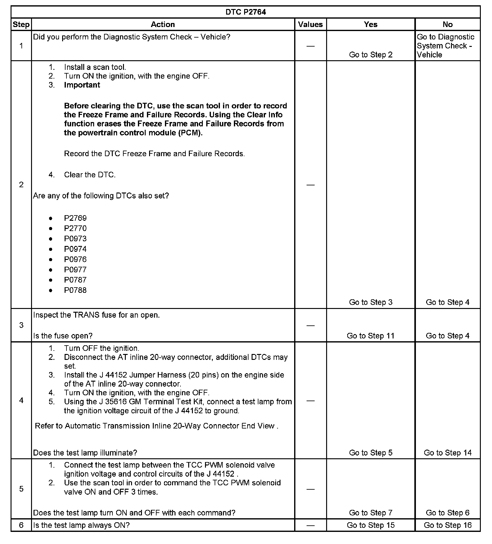 When the PCM detects a continuous open or short to ground in the TCC PWM solenoid valve circuit, then DTC P2764 sets. DTC P2764 is a type B DTC.