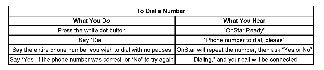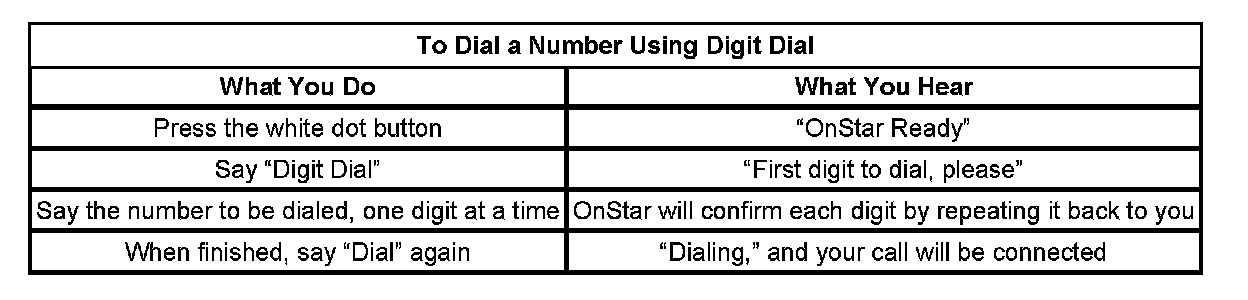 After 3 unsuccessful tries, or if you simply like it better, you can use the "Digit Dial" command to input digits one at a time. Digit Dial is set up to dial phone numbers like previous OnStar Personal Calling Systems.