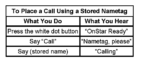 Customers have the ability to store telephone numbers within the module, referenced by a nametag for the convenience of frequently dialed numbers. This process is initiated by pressing the answer/end call button, waiting for the system response, then speaking the response "store". The system will respond with "number please" at which time the user should enter the number desired to be stored. Once complete, saying the word "store" again lets the system know you are finished entering the number. At this time, the system will elicit the user to assign a nametag to that number. From this point forward, the user can dial this number by initiating the OnStar(R) personal calling (OPC) feature, speaking the word "call," and repeating the nametag assigned. To delete a nametag, the user should initiate OPC, say "delete" then speak the nametag to be removed. In the event a nametag cannot be deleted in spite of repeated attempts from several speakers, the OnStar(R) module will require replacement.