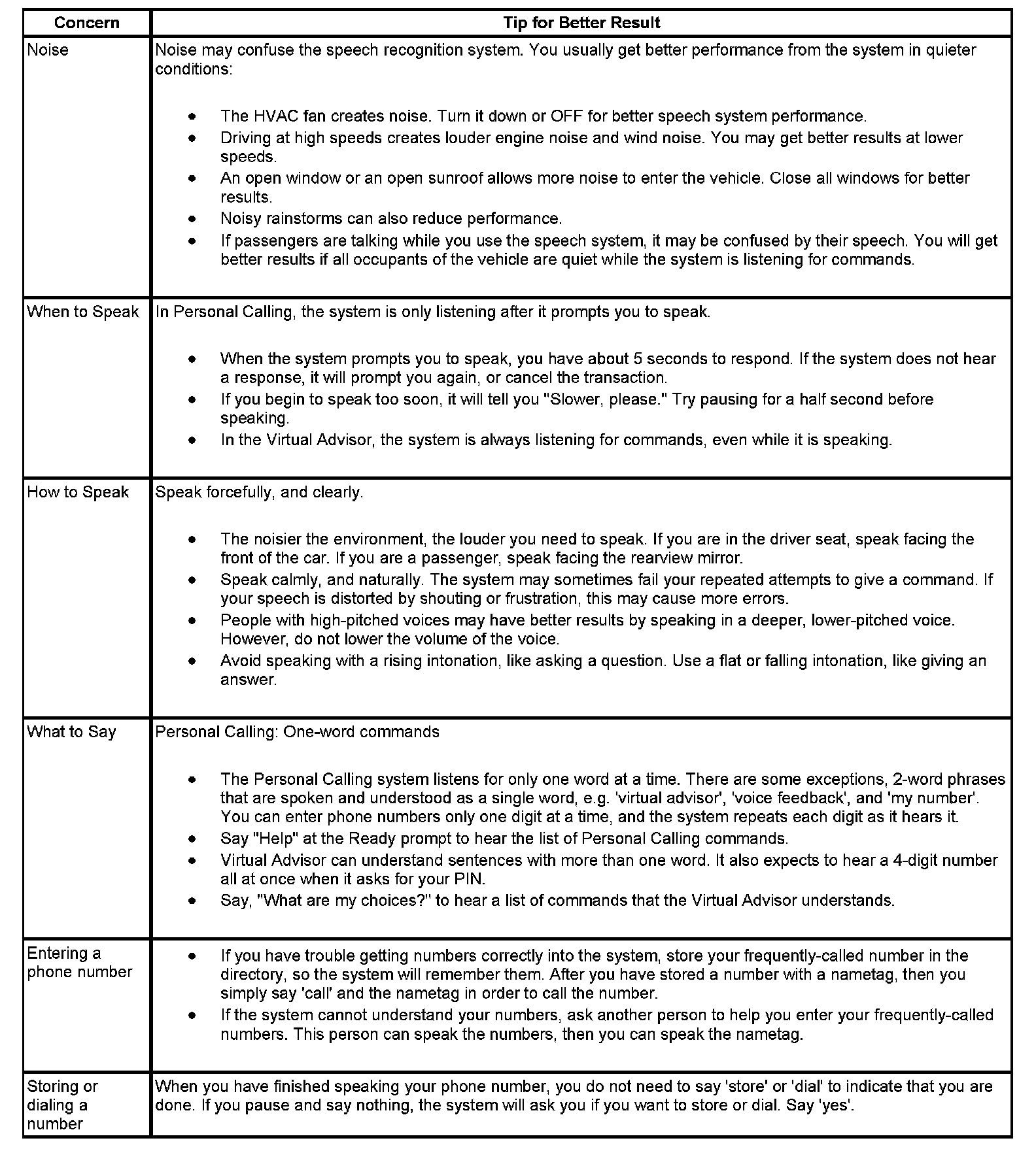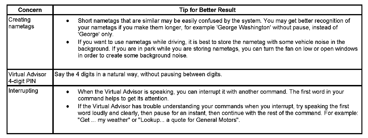 The OnStar(R) speech recognition systems use speech technology that is designed to understand a wide range of American English speakers. Although there is no one right way to speak English, the system will work best when users try to modify their pronunciation should they encounter difficulty. Users who do not obtain good results are advised to try the tips and workarounds found.