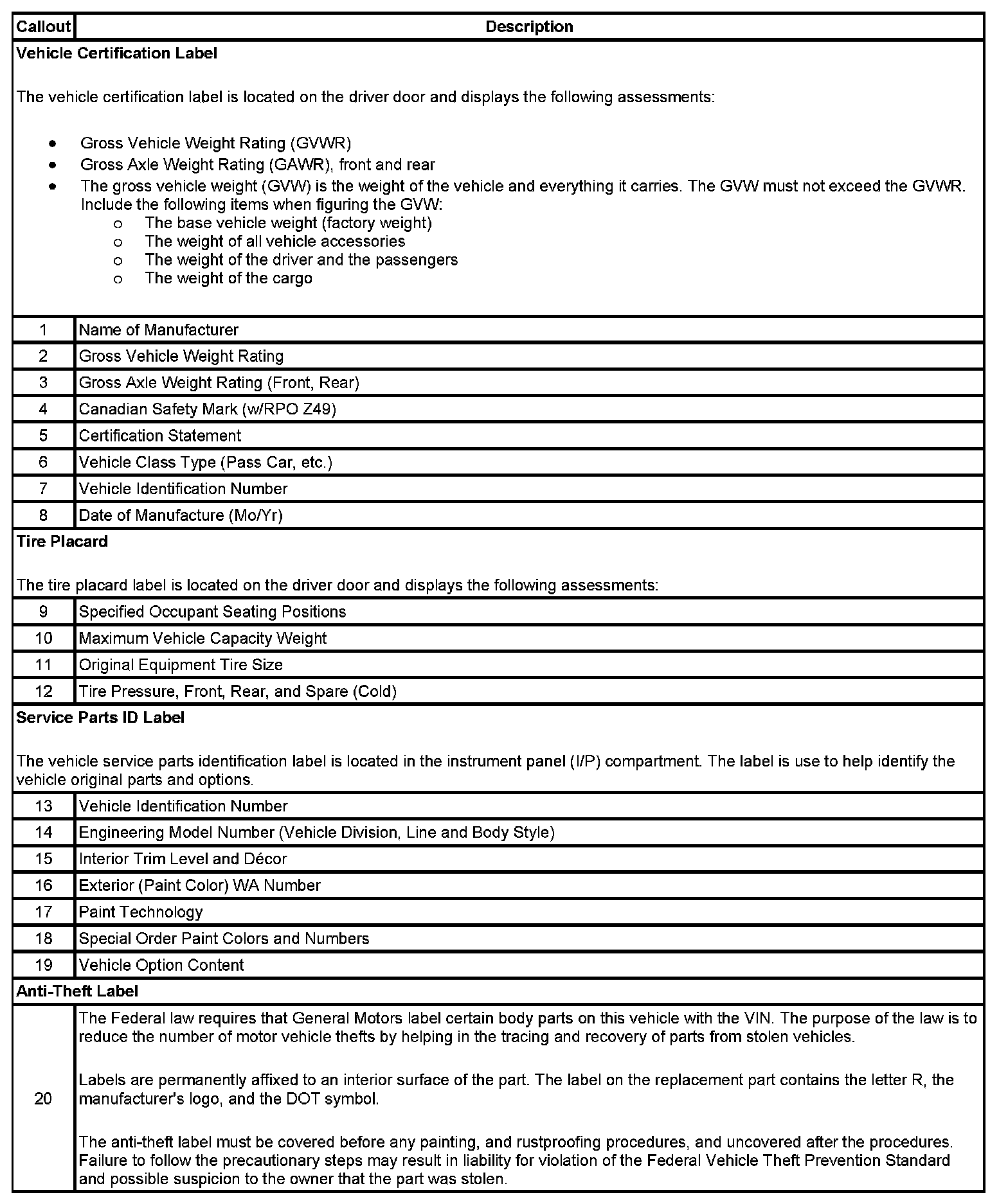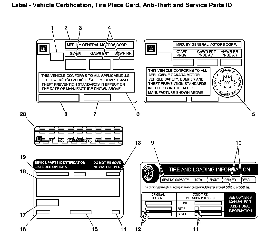 Label - Vehicle Certification, Tire Place Card, Anti-Theft And Service Parts ID: