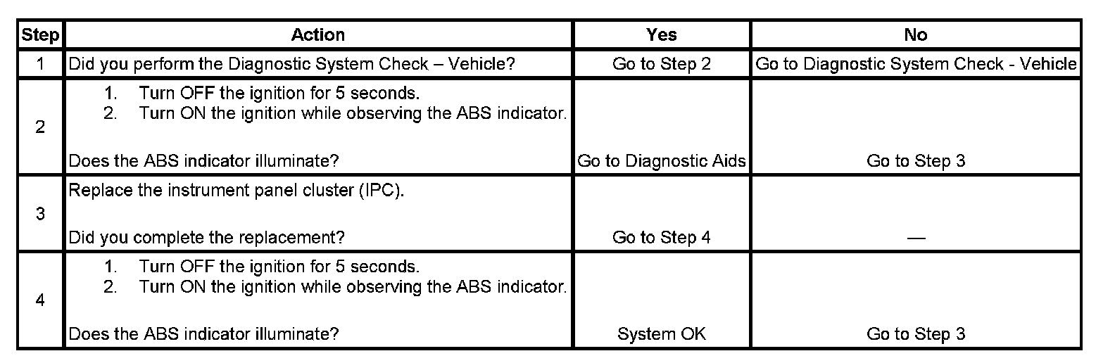 Replace the Instrument Panel Cluster if the ABS indicator intermittently fails to operate during the bulb check.