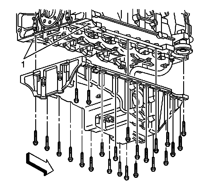 11. Place 2 oil pan bolts in the jack screws on the oil pan and tighten evenly to release the oil pan from the engine (1).