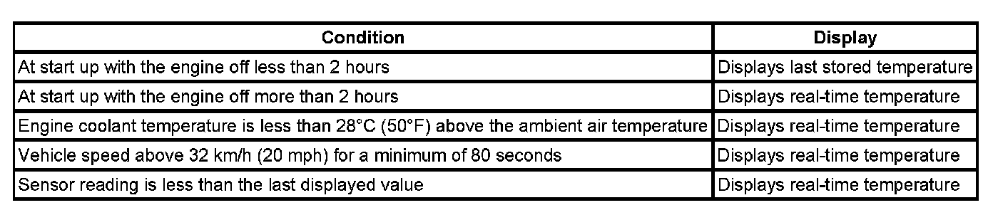The ambient air temperature sensor mounts underhood and can be affected by city traffic, by idling, and by restarting a hot engine. Therefore, the HVAC control module filters the value of the ambient air temperature sensor for temperature display. The ambient air temperature value is updated the conditions.