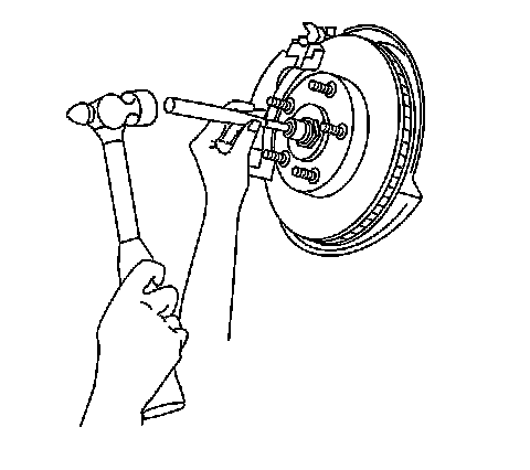 6. Disengage the wheel drive shaft from the wheel hub and bearing. Place a brass drift against the outer end of the wheel drive shaft in order to protect the wheel drive shaft threads. Sharply strike the brass drift with the hammer. Do not attempt to remove the wheel drive shaft from the wheel hub and bearing at this time.