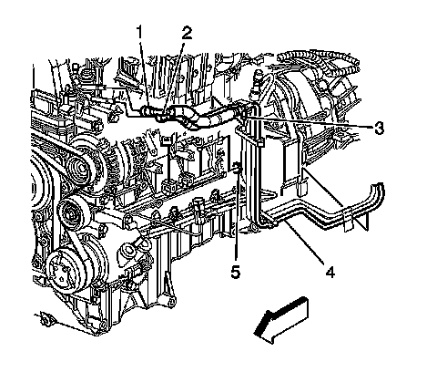 4. Remove the EVAP/fuel hose/pipe assembly retaining bolt (3) from the transmission.