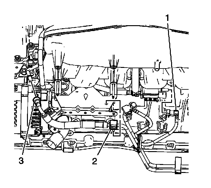 8. Position the fuel feed pipe (3) above the PCM studs.
