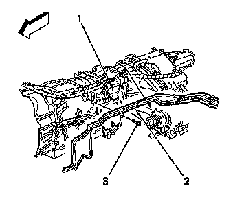 2. Position the fuel EVAP/fuel hose/pipe assembly against the transmission and install the retaining bolt (3) through the EVAP/fuel hose/pipe assembly strap into the transmission.