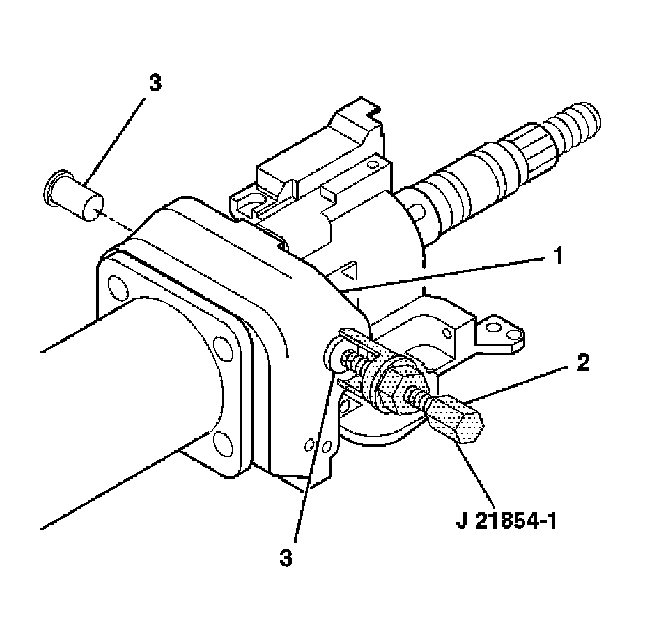 7. Remove the 2 pivot pins (3) from the steering column tilt head assembly (1) using J21854-01.