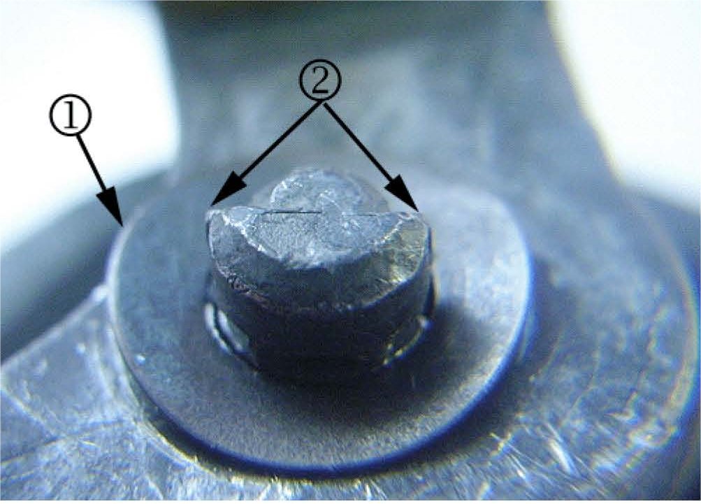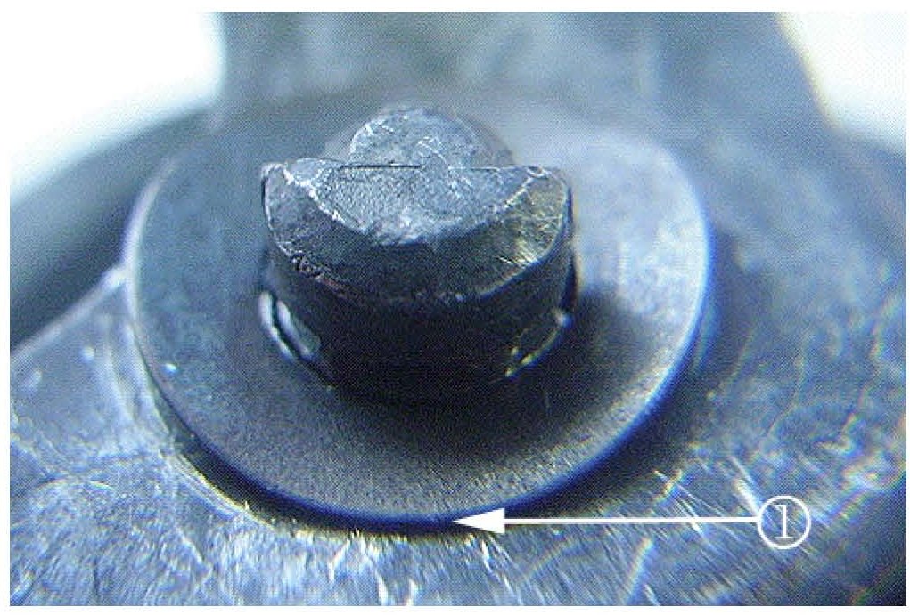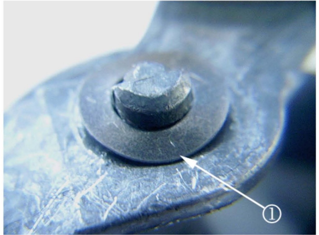 Position the wave washer (1) with the curved edges of the wave spring parallel to the tabs (2) on the lock cylinder shaft.