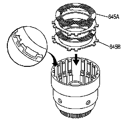 2. Install the overrun clutch plates into the input housing starting with a steel plate (645B) and alternating with fiber plate assemblies (645A).