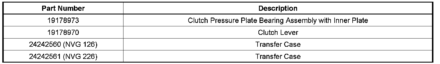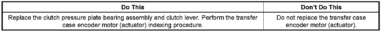A more robust clutch pressure plate bearing, inner plate and clutch lever has been released for service. Replace the clutch pressure plate bearing, inner plate and clutch lever. Refer to the Transfer Case Disassemble and Transfer Case Assemble procedures in SI. Former and new parts should not be intermixed during transfer case overhaul and they are to be used in sets only.