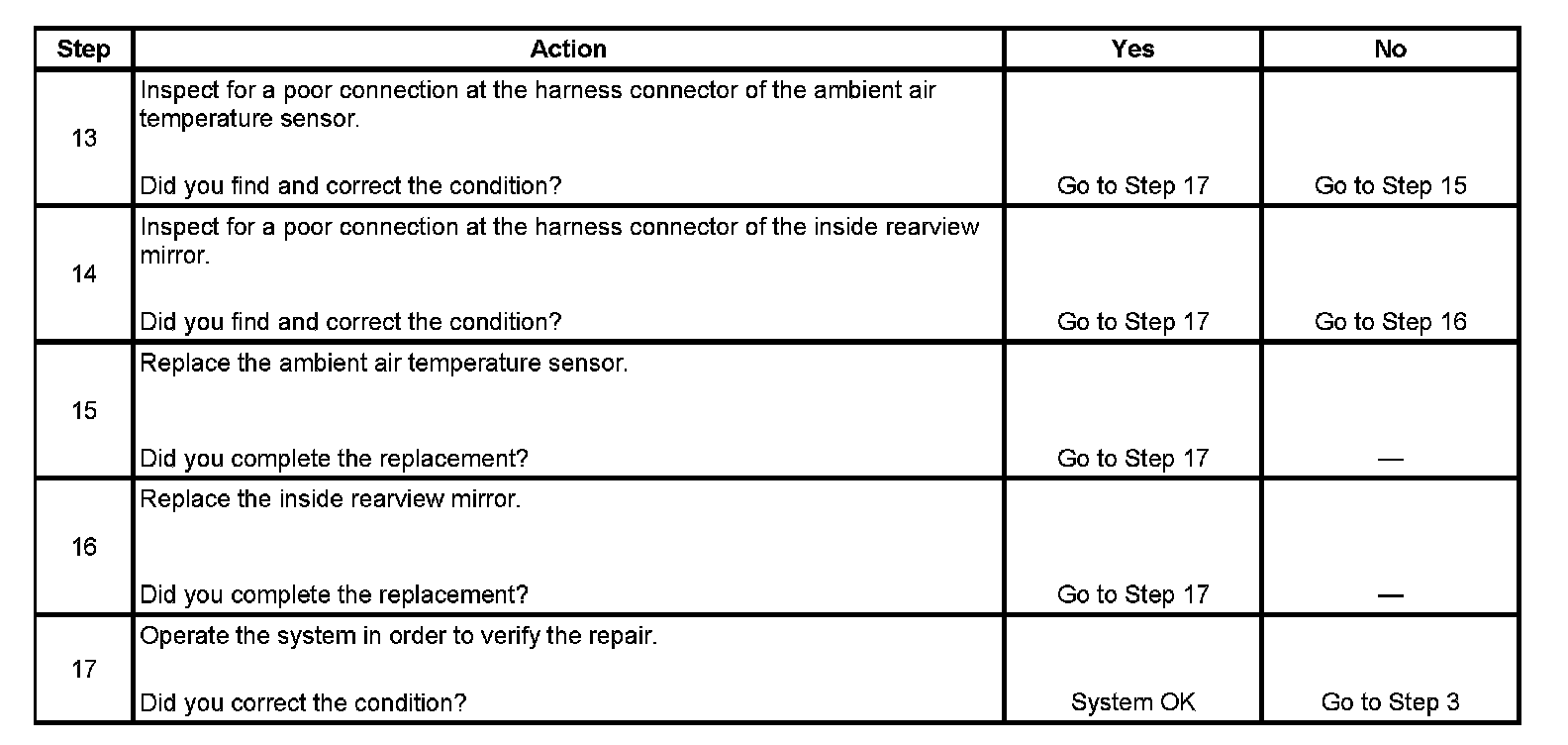 The table will be used to measure the resistance of the sensor and compare it with the actual ambient temperature. The mirror's temperature accuracy should be within 5 degrees of the actual temperature. The actual temperature should not be taken from a radio station, a sign displaying the temperature, etc. A temperature measuring tool such as a thermometer should be used. Some temperature measuring tools may be within 5 degrees of the actual temperature. Make sure to consult the manufacturer for the accuracy of the tool. This comparison can make the mirror seem off by 5-10 degrees of the actual temperature when it is not.