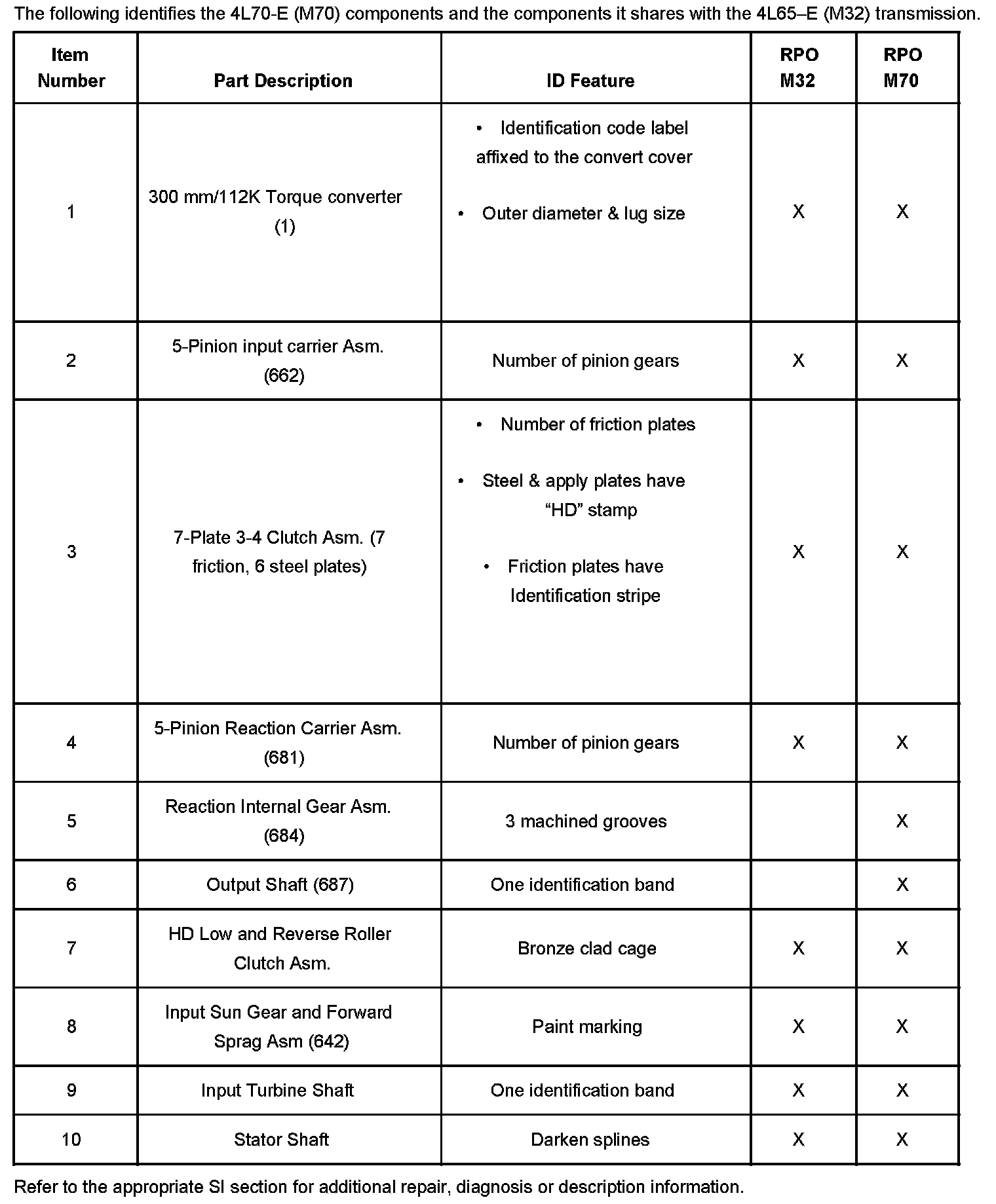The 4L70-E will be first introduced in some 2006 mid-size sport utilities and full-size pickups. The 4L70-E will be identified as RPO M70. The M70 will use the large 300 mm (101K or 112K) torque converter. Some M70 models will be the first 4L60 series transmissions to receive the new input speed sensor (ISS).