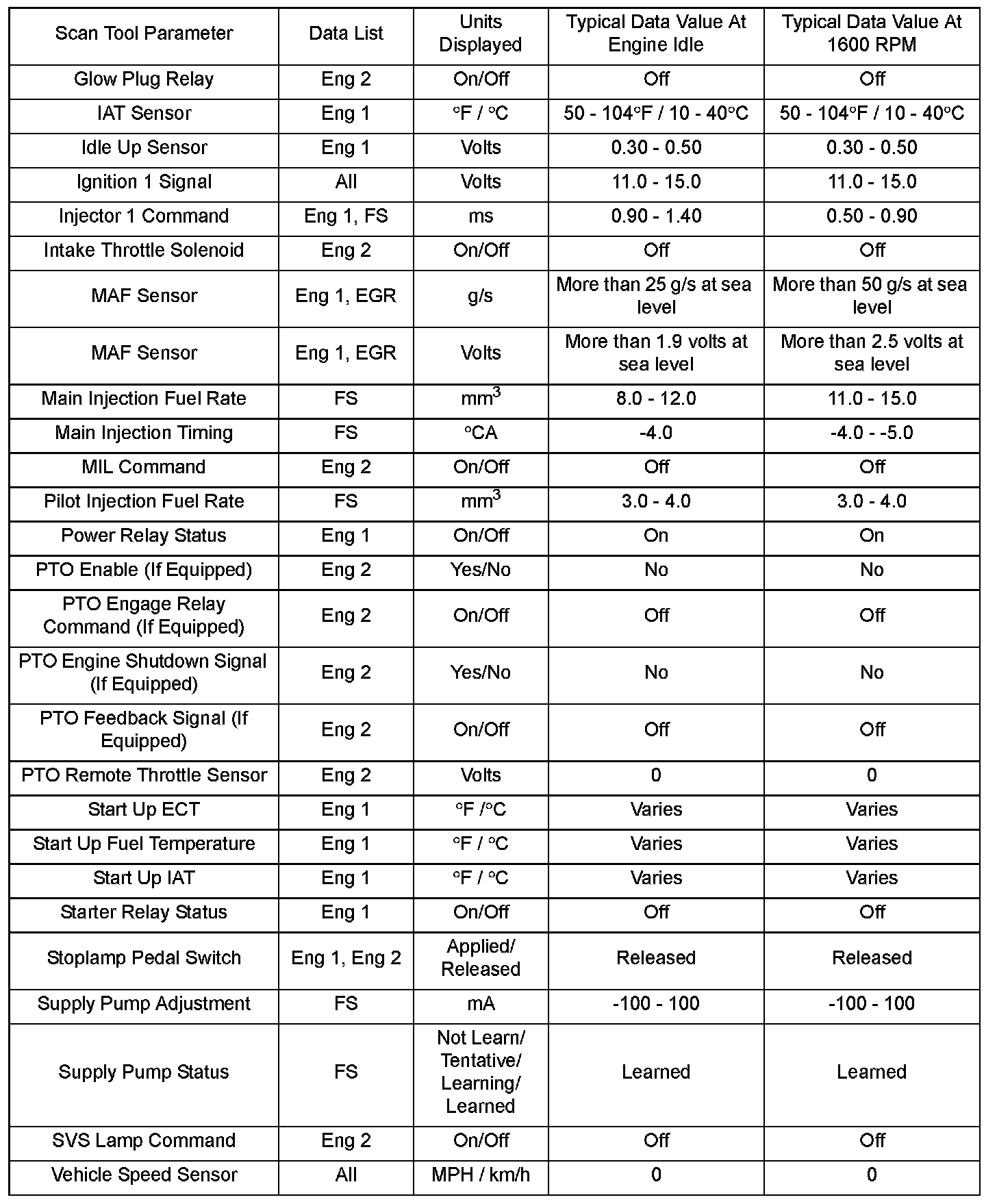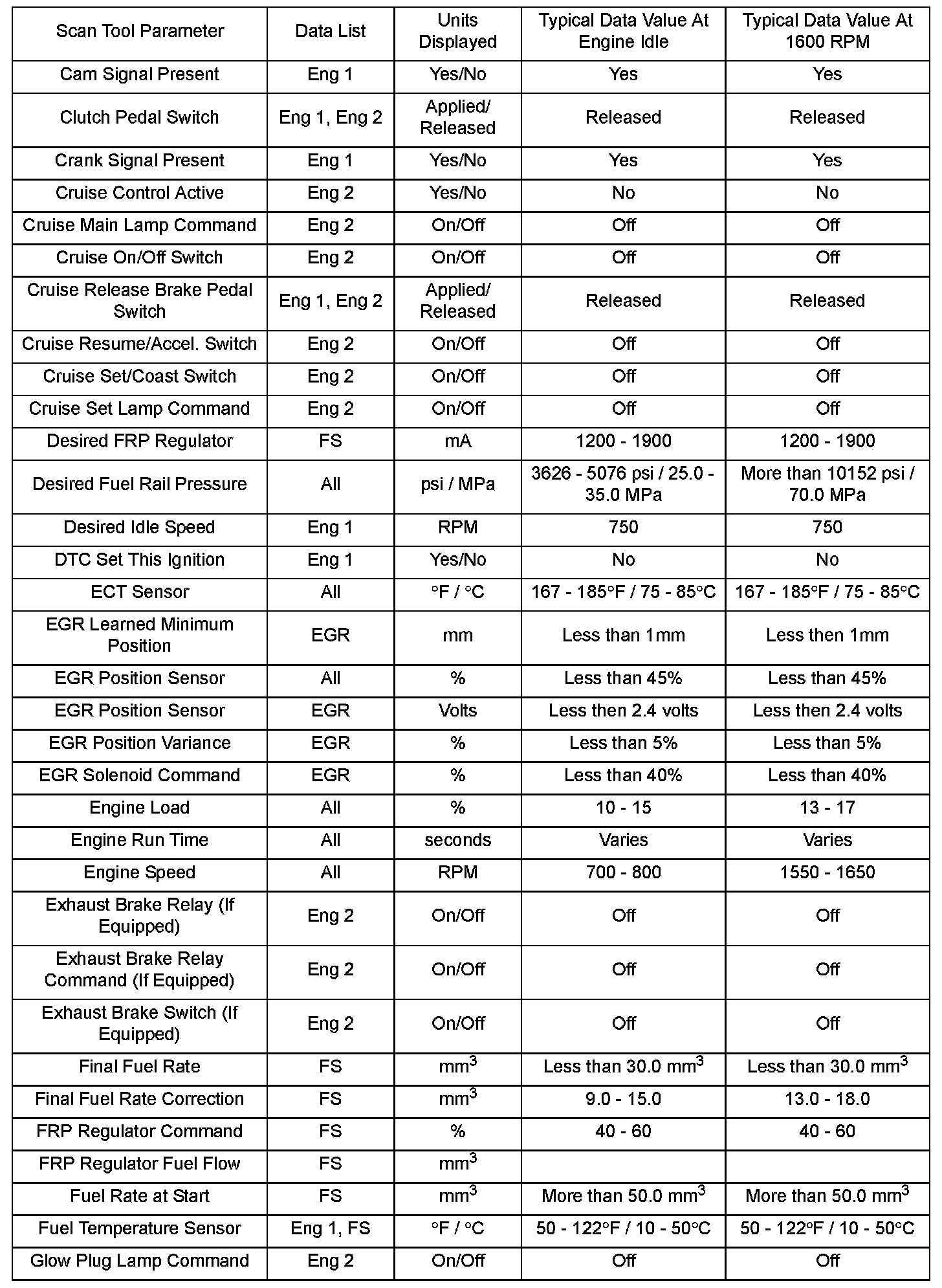 Scan tool values from a properly running engine may be used for comparison with the engine you are diagnosing. The Engine Scan Tool Data List represents values that would be seen on a normal running engine.