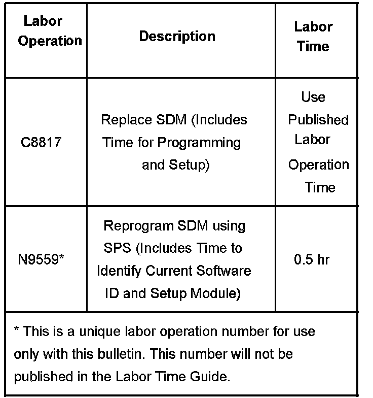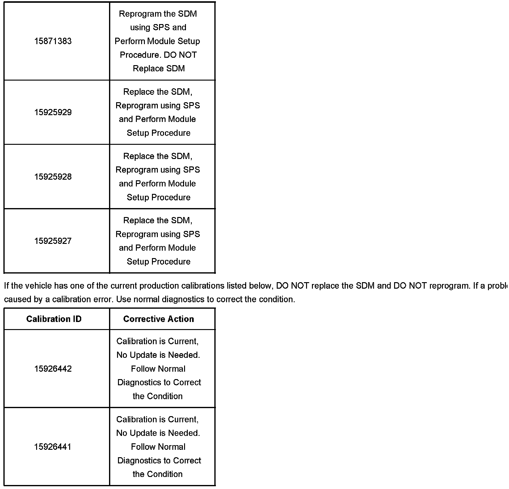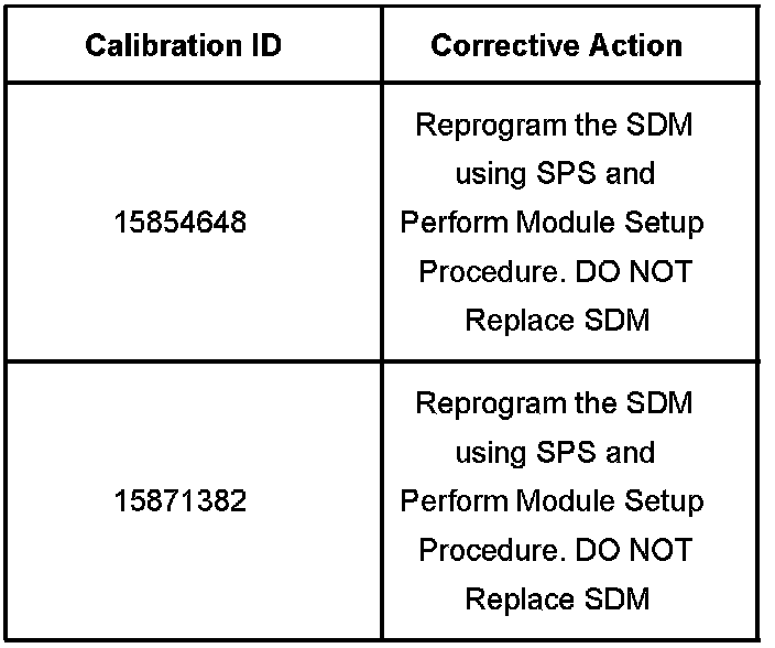 It is important that you first identify the calibration number that is in the SDM. This can be done using the Tech 2(R) and requesting module ID. The calibration number will determine if the SDM calibration can be updated or if the SDM will need to be replaced before the new calibration can be installed. Use the table's shown to identify the proper corrective action that is required.