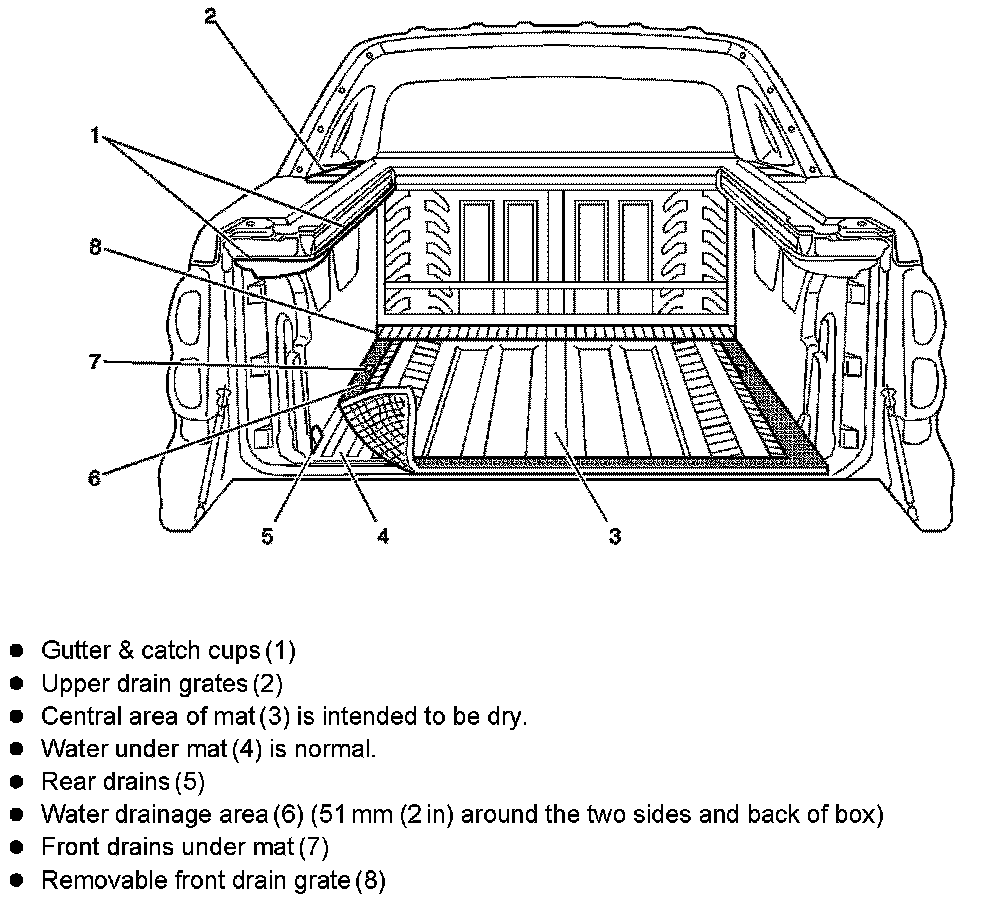 The Water Management System is designed to quickly direct water out of the cargo box. With cargo covers in place there may be certain conditions (e.g.; heavy rains automated car washes) where some water may be present in the following areas: