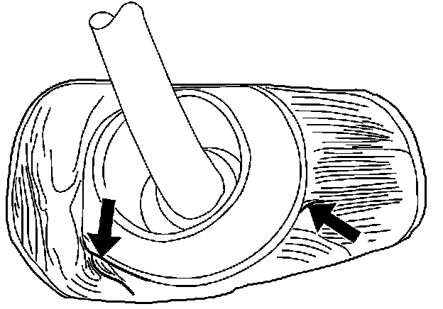 Run water over the front of the rubber roof ditch molding. If water leaks at the location the customer described, remove the rubber ditch molding and look for a sealer void between the roof ditch sealer melt strip and the sealer patch. Refer to the illustration above.
