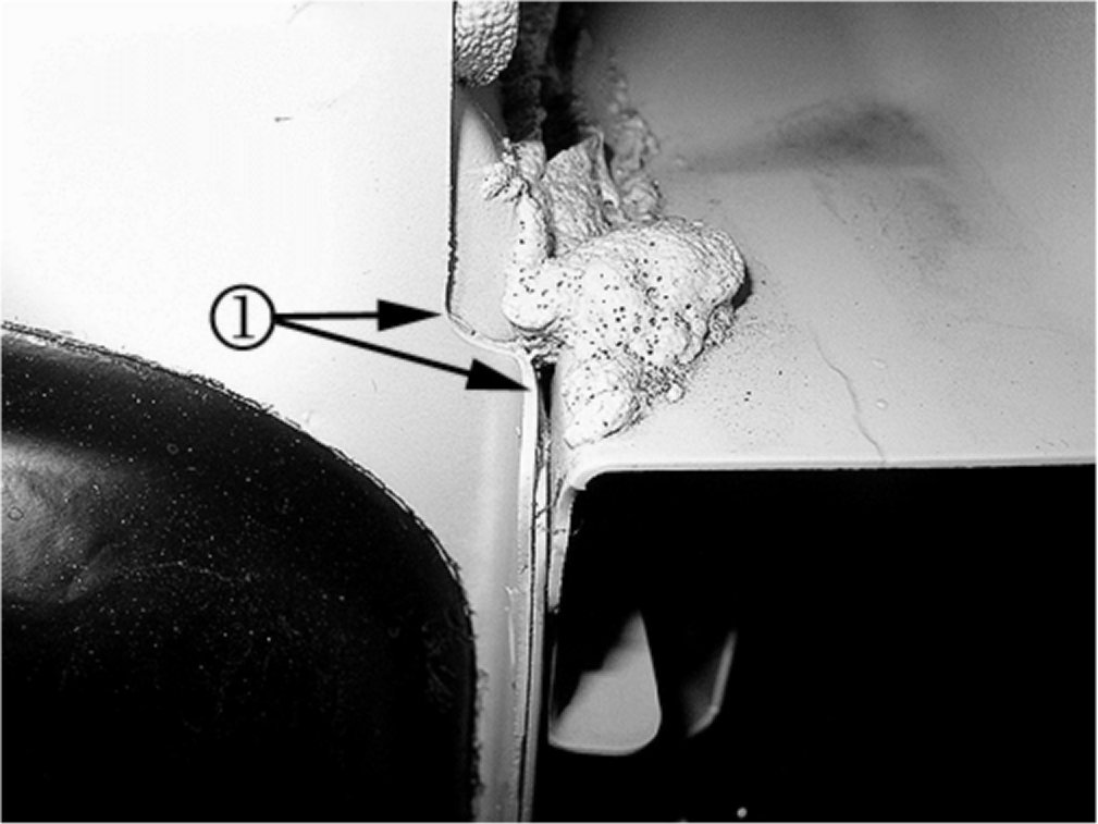 Remove the fender and inspect the lower cowl area for a void in the sealant as seen in the illustration above.