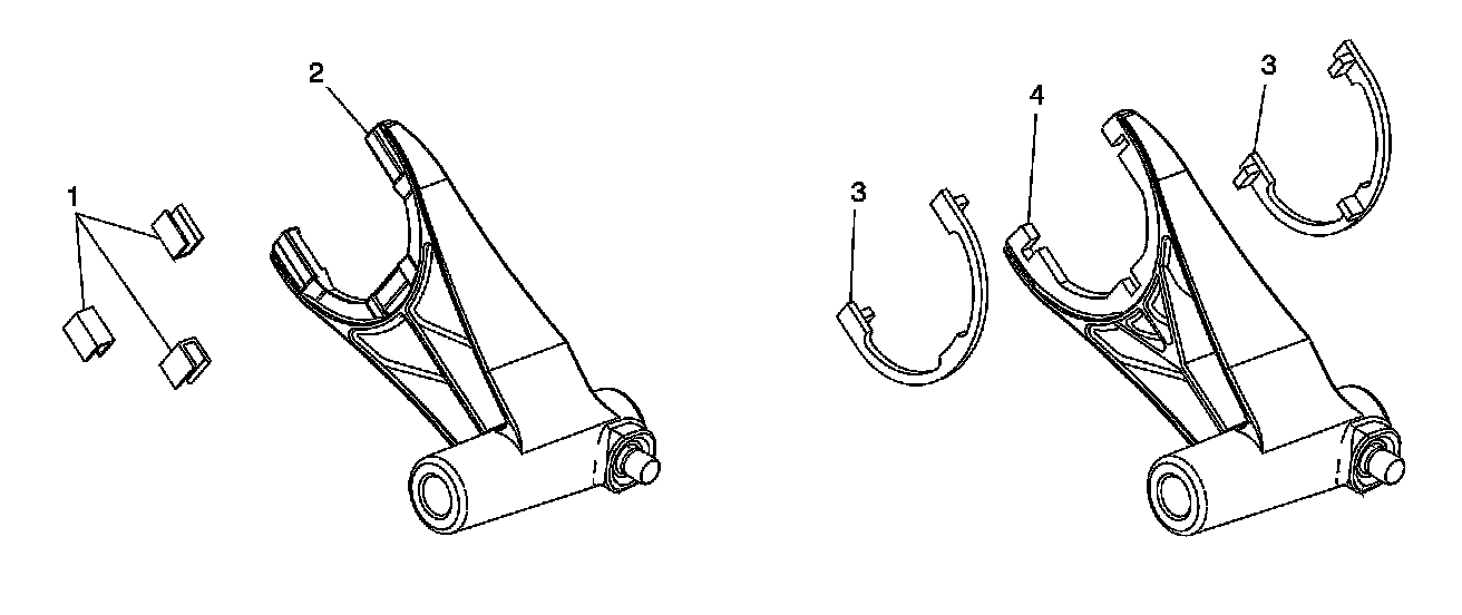 Interim 2012 model year the High/Low shift fork, fork pad and High/Low clutch design changed. The first design forks (2) can be identified as having three flat un-notched fork pad areas with three separate fork pads (1). The second design forks (4) can be identified as having a half-round shaped pad area with three notches for pad orientation and installation and upper and lower half-round fork pads (3). The second design shift fork (4) and pads (3) are the only design available for service and must be used with the second design High/Low clutch.