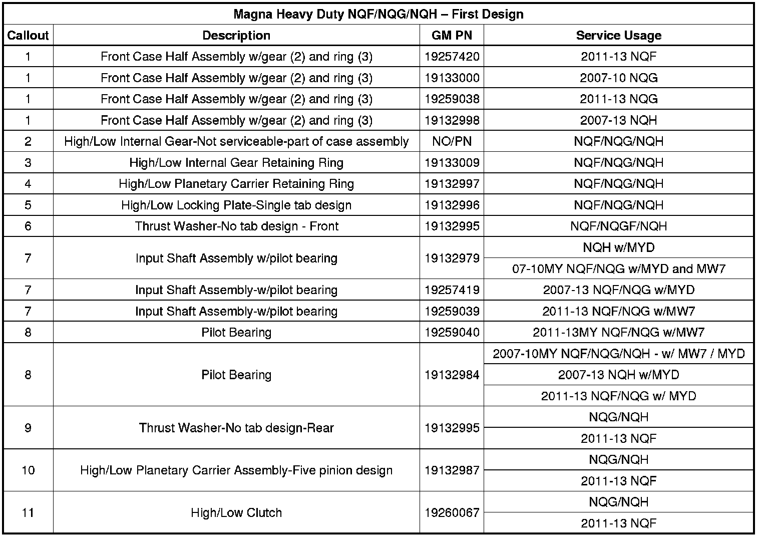 2007-2010 MY Heavy Duty NQF transfer case assemblies were only produced with first-design content. Service 2007-2010 MY Heavy Duty NQG transfer case service assemblies may contain either first or second design content.