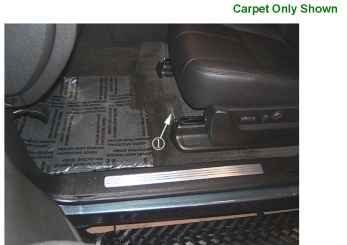 The slit (1) is more noticeable when the seat track assembly is in the full rear position. DO NOT replace the front floor carpet or rubber floor covering. A service replacement carpet or mat will contain the same slit.