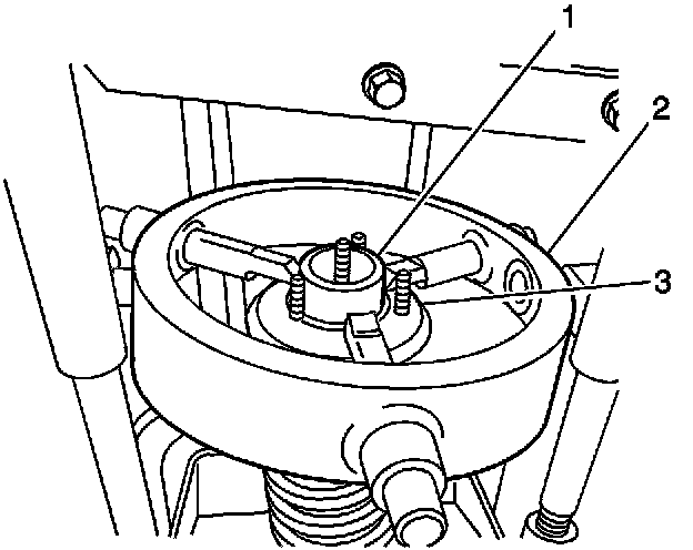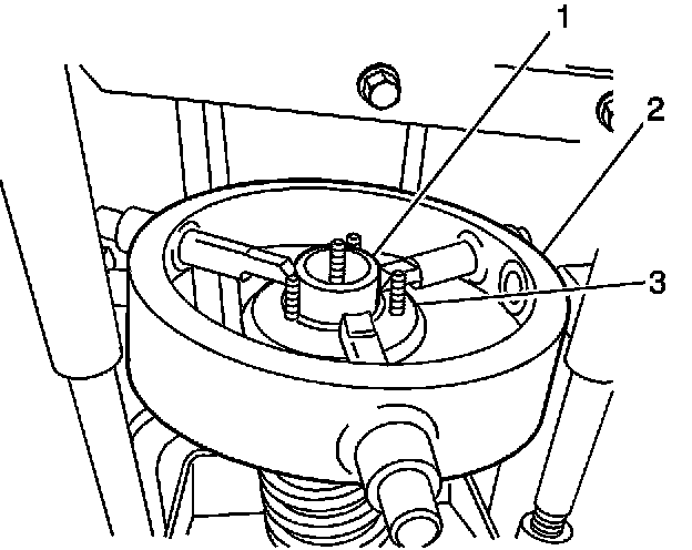Ensure that the fingers for the spring compressor are properly adjusted on the top of the front suspension mount. Position the shock absorber assembly (3) in the J 45400 (2) so that the fingers are properly seated on the top of the front suspension strut mount (1).