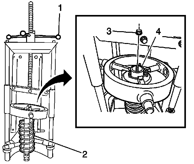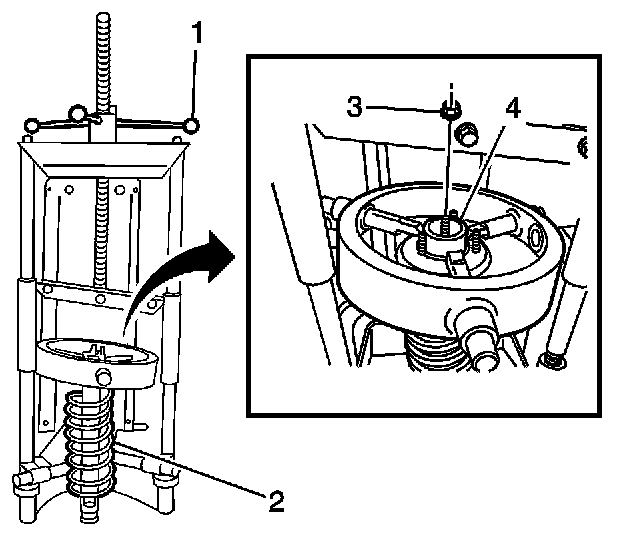 Using the J 45400 (1), compress the spring assembly (2) enough to install the NEW nut (3). Install the shock absorber (4).