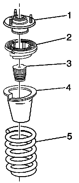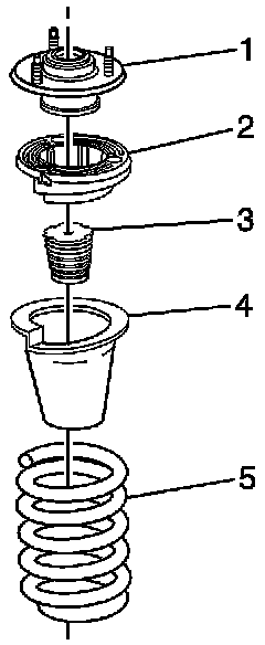 Assembly the front suspension strut mount (1), front spring upper seat (2), front suspension strut bumper (3), and the front spring (5).