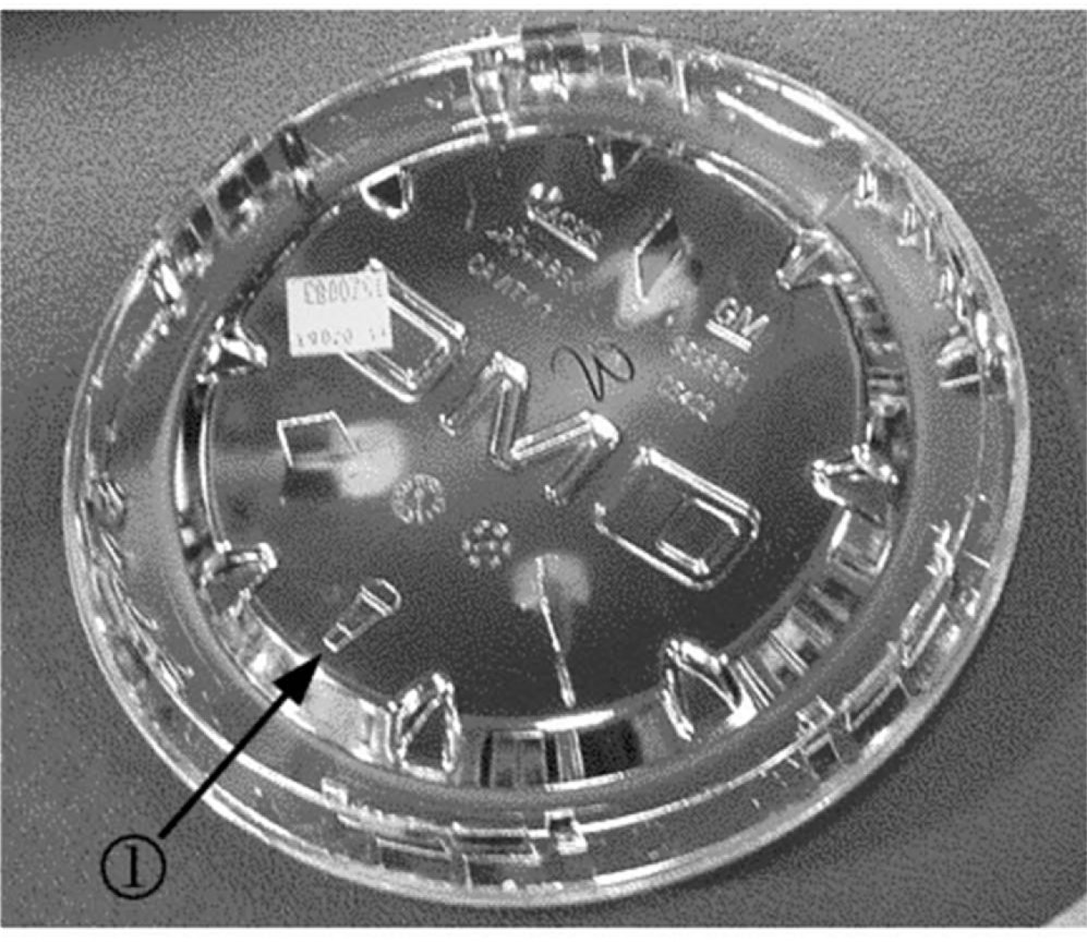 The wheel center cap for which a specific orientation is required will have a tire valve stem icon on the back face (1). This icon should be aligned with the location of the tire valve stem.