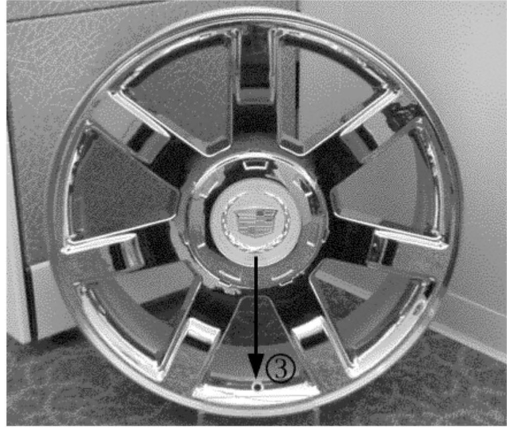 On Cadillac wheels, the tire valve stem should be directly below the bottom point of the Cadillac wreath and crest logo (3). Also, the seven small recesses at the edge of the wheel center cap should each be aligned with a spoke.