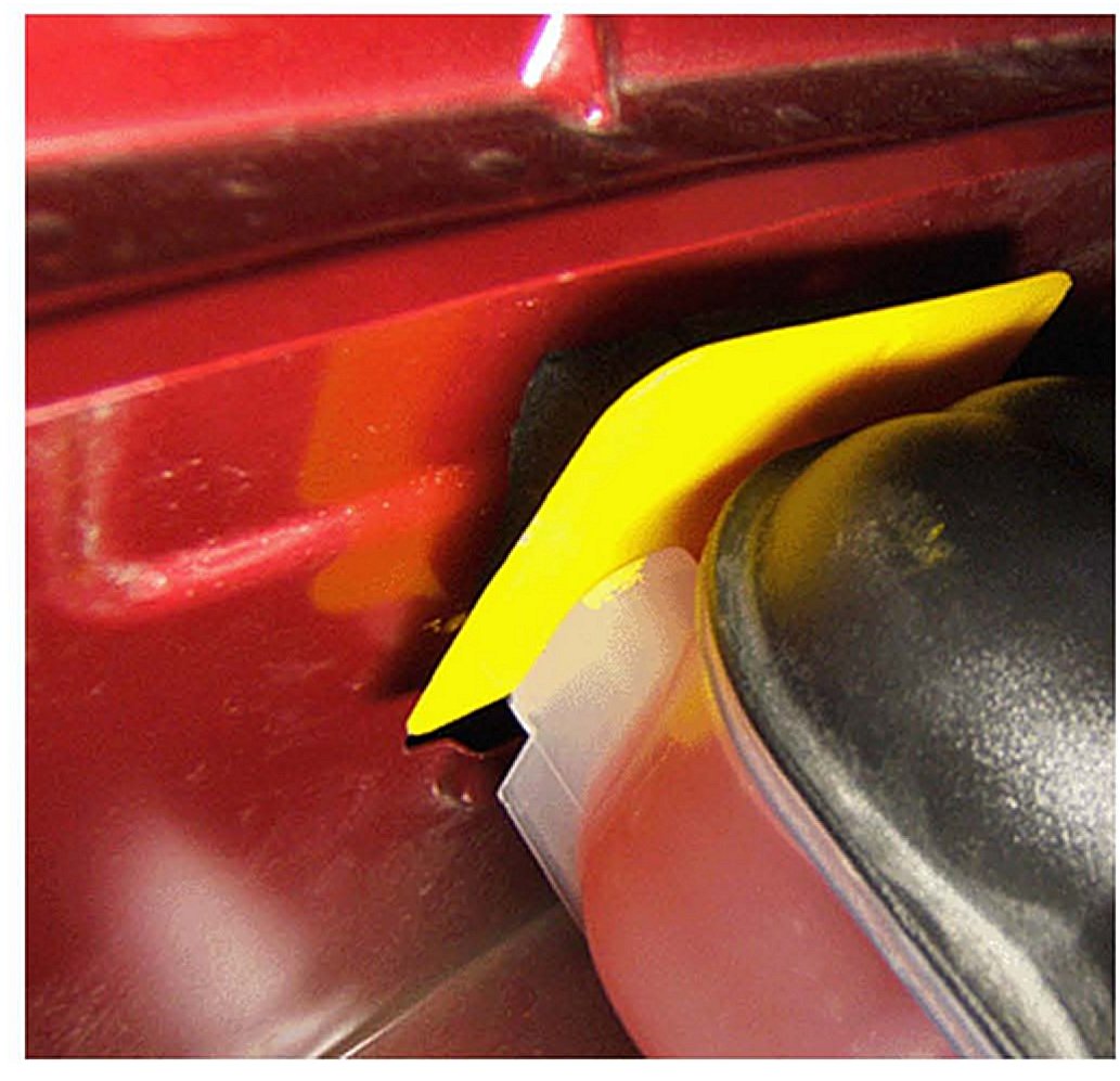 Use a plastic putty scraper to help prevent the rolling of the foam when installing the radiator surge tank as shown above. Install the radiator surge tank plastic tab into the matching retaining slot inside the right inner fender.