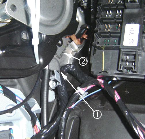 - The IP wiring branch to C202 may have been pushed up and forward into the park brake assembly and the retaining clip off the branch may not have been fully seated. Possible points of contact (1, 2).