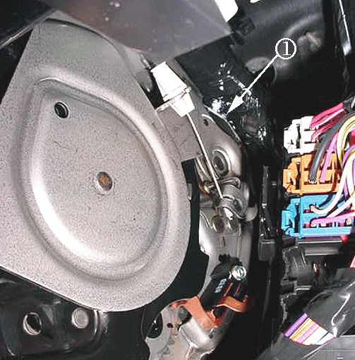 - When releasing the park brake pedal, the moving part (1) at the end of the park brake release cable may be coming into hard contact with the IP harness.