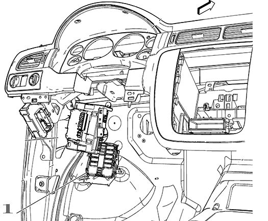 3. Locate the junction block (1) on the driver side of the vehicle under the instrument panel (IP).
