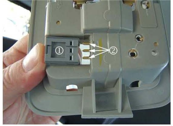 4. Slide the lamp switch(es) (1) away from the three electrical contact tabs (2) located on the back of the housing.