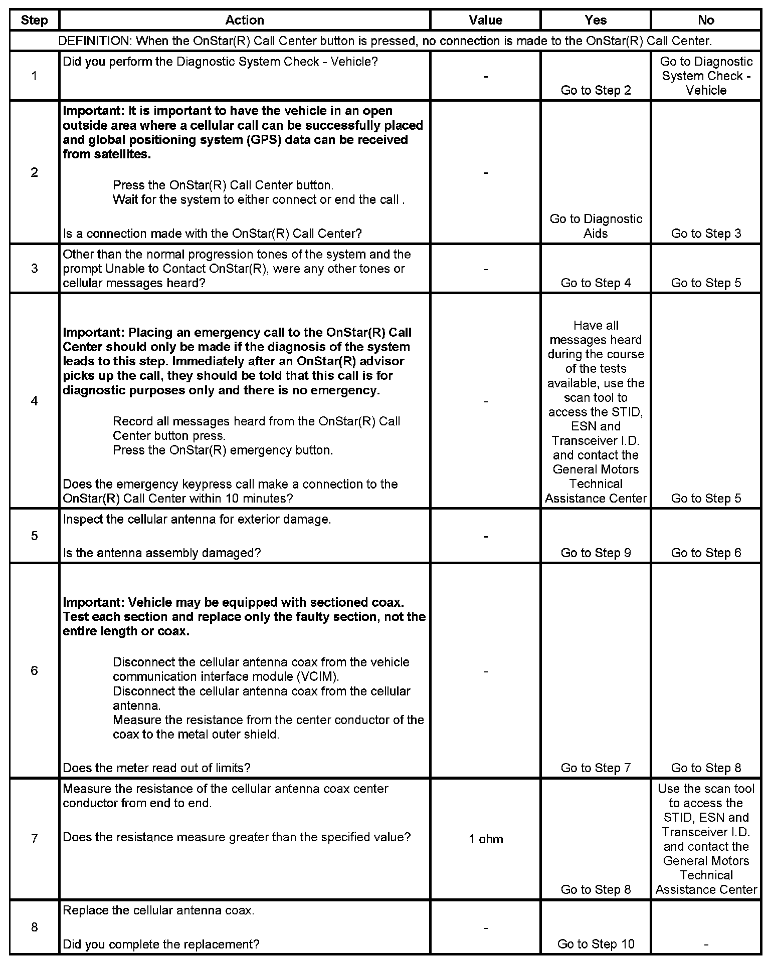 * If an OnStar(R) emergency call is able to successfully connect the vehicle to the OnStar(R) Call Center when an OnStar(R) Call Center button press is not, there may be a failure in the ability of the OnStar(R) system in the vehicle to be recognized by the local cellular carrier.