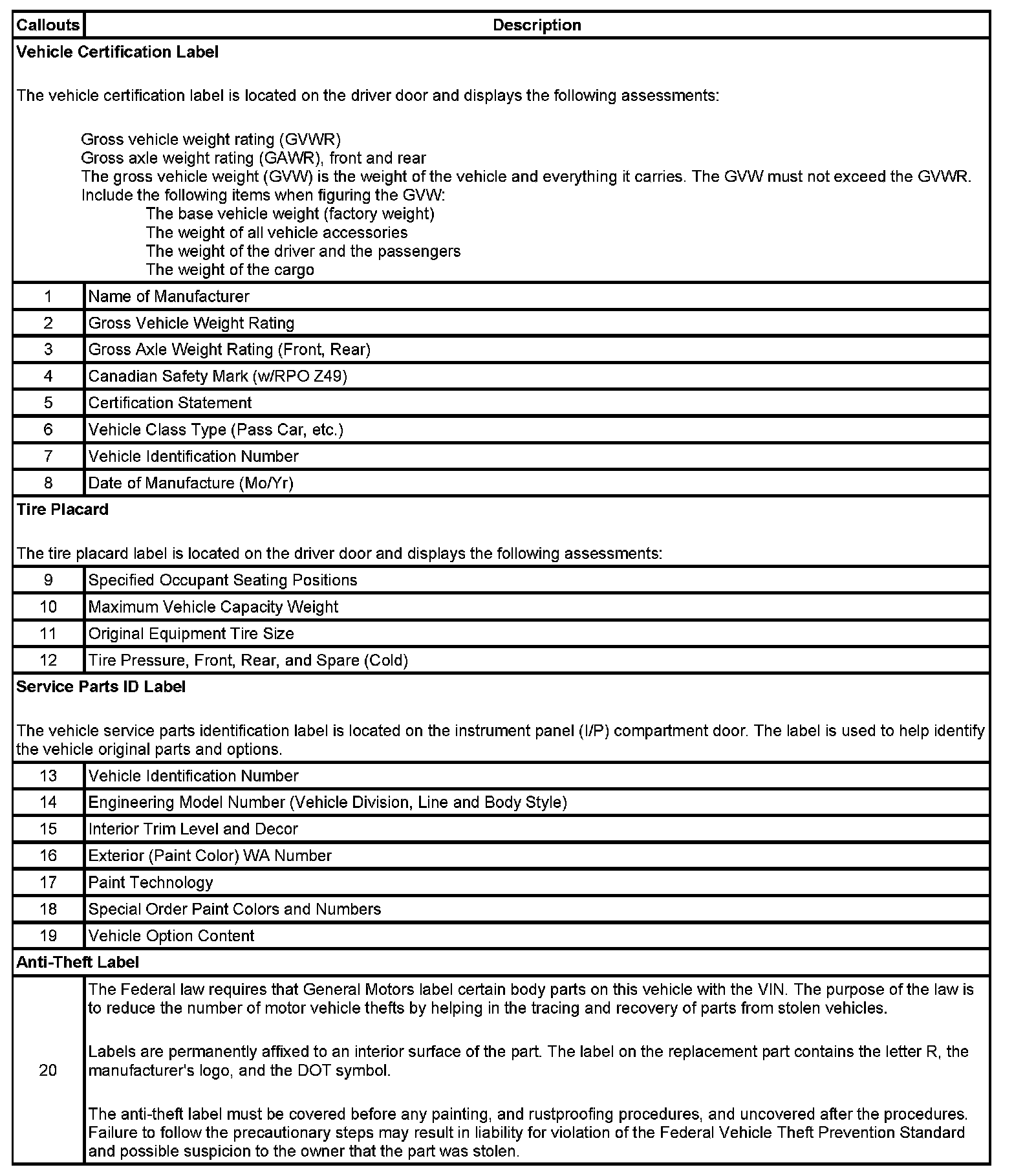 Vehicle Certification, Tire Placard, Anti-Theft, and Service Parts ID Label