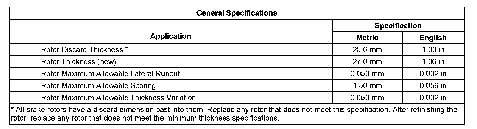 Disc Brake Component Specifications: