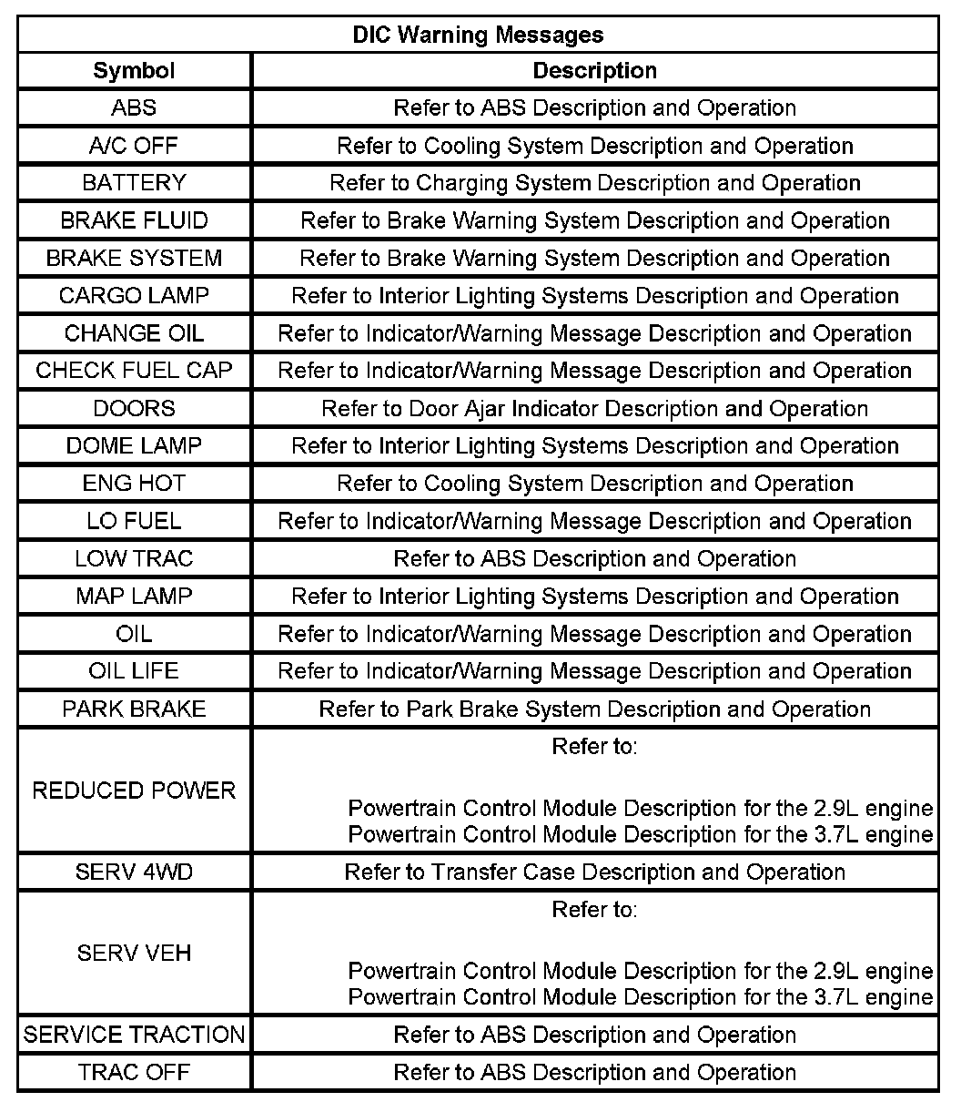 The IPC illuminates the OIL message in the DIC when the PCM detects a low oil pressure condition with the signal circuit low. The IPC receives a class 2 message from the PCM requesting illumination.