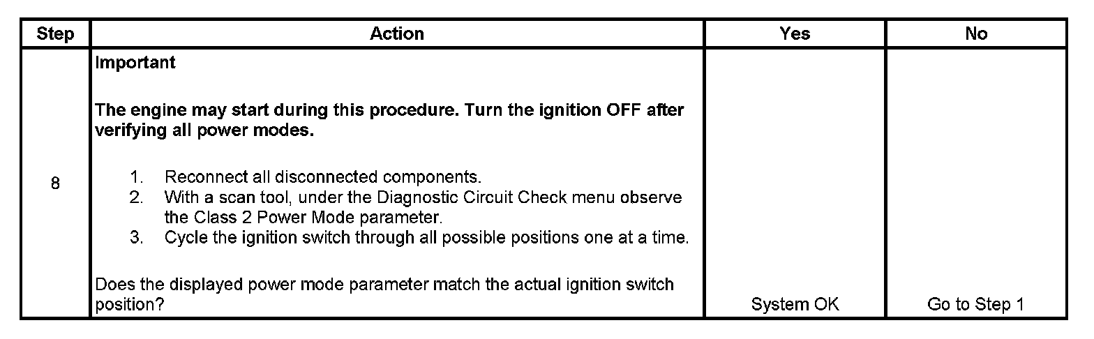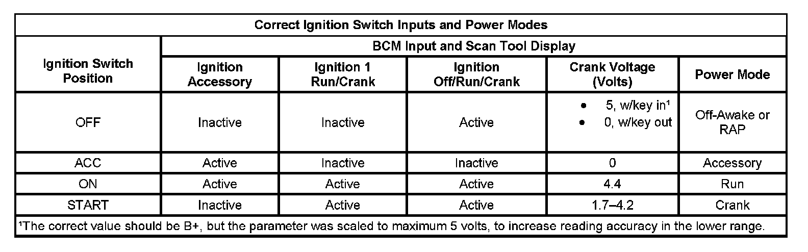 The body control module (BCM) monitors the ignition inputs Ignition Off/Run/Crank, Ignition 1 Run/Crank and the Ignition Accessory signals supplied from the ignition switch. The BCM uses the sequence that the signals appear, their voltage levels and the engine run flag (ERF) status to determine the power mode. Battery voltage is supplied to the ignition switch by the IGN TRANSD fuse. The ignition key resistor signal from the BCM provides a 5-volt supply voltage to the ignition switch. The table below shows the correct ignition switch inputs and power modes.