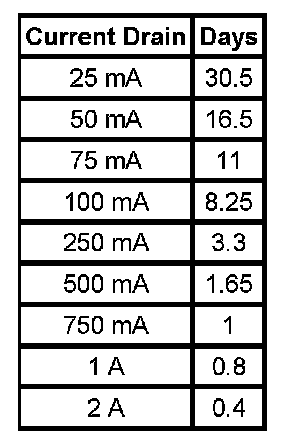 * The battery run down time will vary depending on cold cranking amperage (CCA) and reserve capacity (RC). If the CCA and RC are higher, then the battery run down time would be longer. If the CCA and RC are lower, then the battery run down time would be shorter. The graph below indicates roughly how many days a 690 CCA battery with at 110 min. RC (60.5 AH) starting at 80 percent state of charge will last with a constant current draw until it reaches 50 percent state of charge. Differences in battery rating and temperature will affect the results.