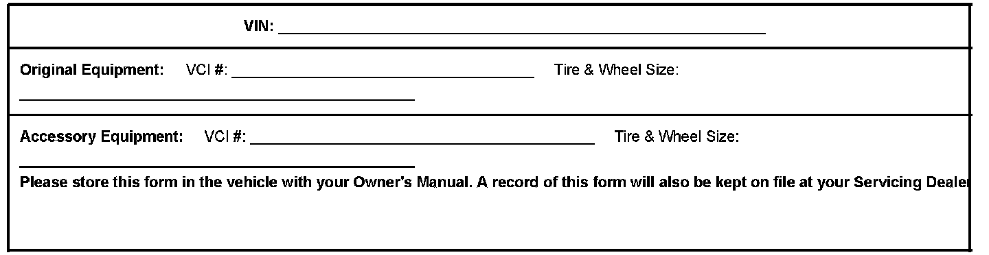 You have just modified your vehicle by installing an "Accessory Package" which includes Wheels and Tires. This form contains important information about your accessory installation. In an effort to provide superior service to you, our customer, we ask that you please present this form to your Servicing Dealer when removing or installing wheels and tires on your vehicle. This form contains important information necessary to service your vehicle.