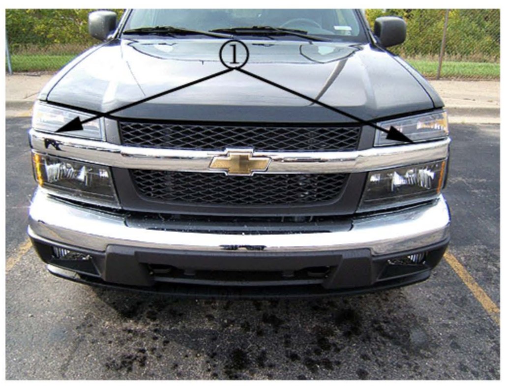 Use masking tape to tape off the gap (1) between the grille and the lower left and right park turn signal lens. Road test the vehicle and determine the source of the windnoise.