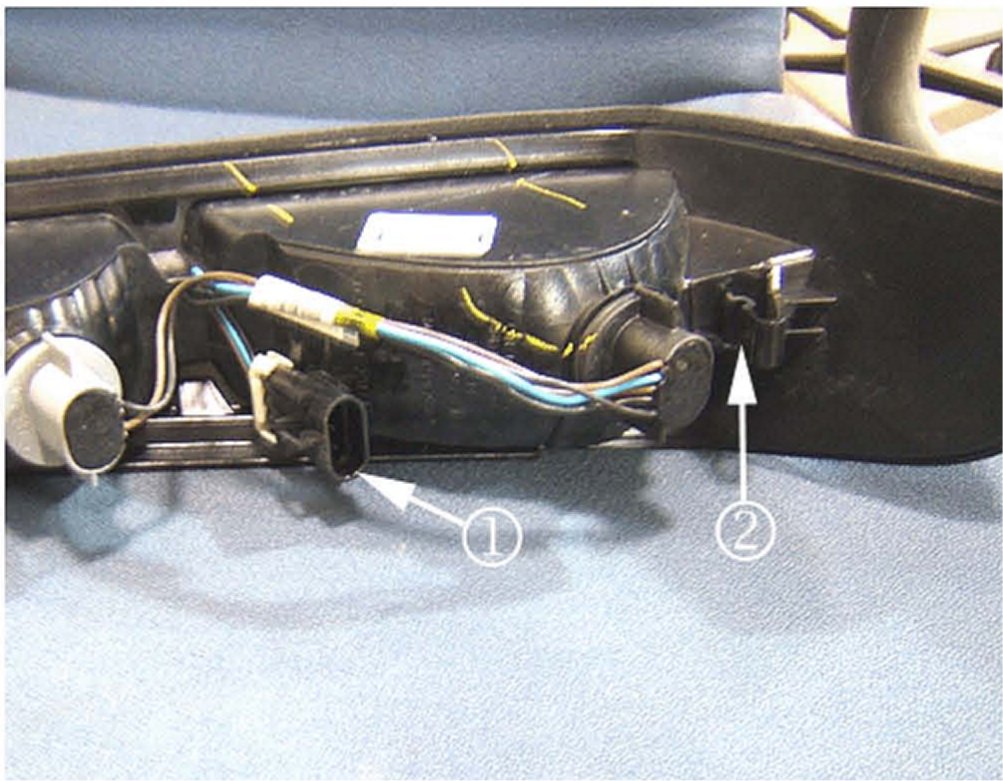 Disconnect the front park turn signal lamp electrical connector (1) from the front wiring harness connector. Then remove the lamp assembly by using a screwdriver to release the outboard retaining clip (2) from the front inner fender.