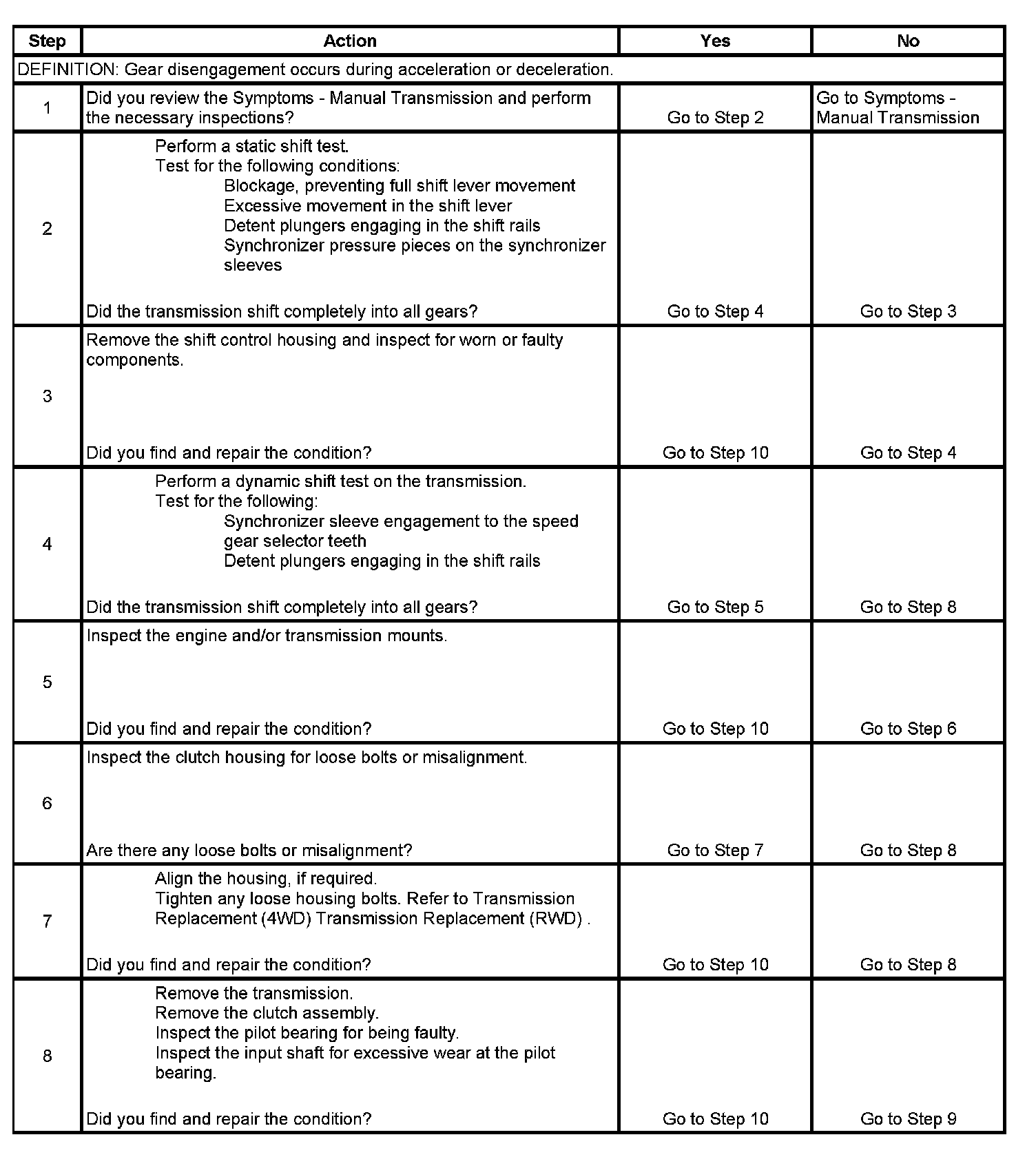 5. This step inspects for worn or damaged transmission or engine mounts. Loose mounts may cause a shock on the transmission, allowing for gear disengagement.